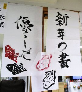 おめでたいことが沢山の一年になるように願いを込めて、皆さまの書き初めに「鯛」を添えていただきました。