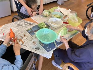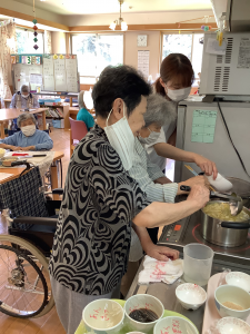 ご利用者と少し手の込んだ五目旨煮作りに挑戦!!今までも煮物などは作っていましたが、ここまで具材の多いおかずは初!!具材の量にビビる職員😱をよそに、ベテランのお母様方は臆する事無く、早速調理開始!!(さ、さすがです😆)